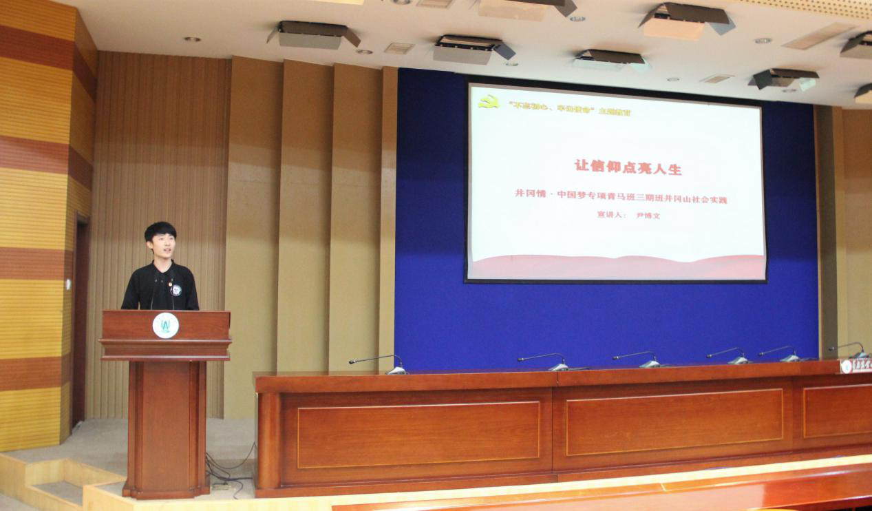 青马工程三期班的井冈情·中国梦专项社会实践团队的尹博文同学以《让信仰点亮人生》为题,分享了青马班学员不忘跟党初心,牢记青春使命,多角度、全方位、深层次地学习井冈山精神的收获,“八角楼的天窗、黄洋界的阵阵炮声、红军战士的草鞋小米加步枪、井冈山革命烈士陵园那几平米的方墙上密密麻麻被刻满的名字……”,成员们通过亲临红色革命根据地,深刻理解了革命先辈的初心使命,坚定了马克思主义信仰。