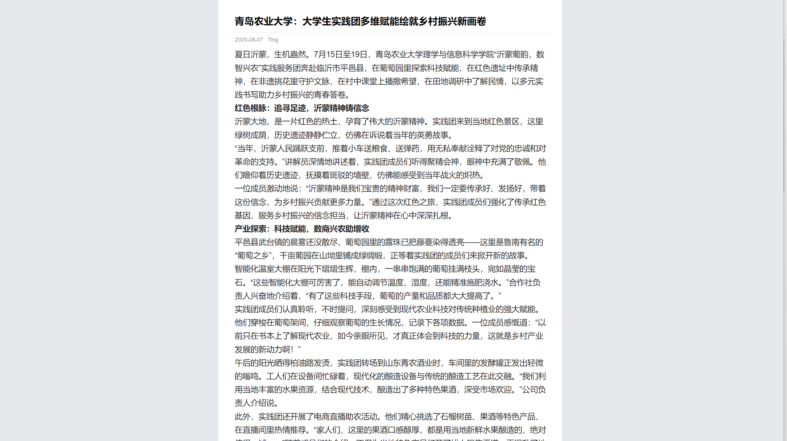7月15日至19日,永利3044noc集团官网理学与信息科学学院“沂蒙葡韵,数智兴农”实践服务团奔赴临沂市平邑县,在葡萄园里探索科技赋能,在红色遗址中传承精神,在非遗挑花里守护文脉,在村中课堂上播撒希望,在田地调研中了解民情,以多元实践书写助力乡村振兴的青春答卷。
