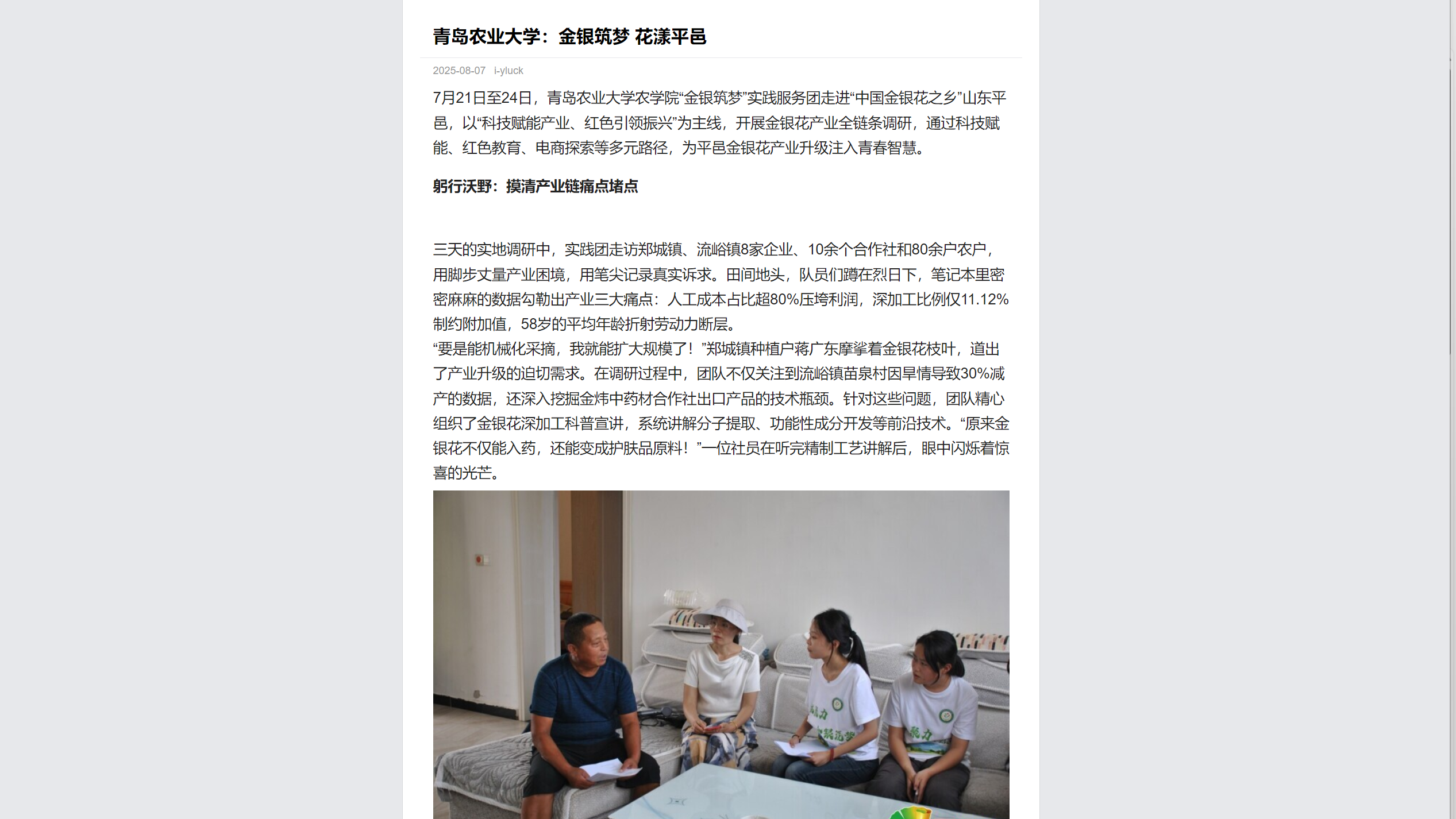 7月21日至24日,永利3044noc集团官网农学院“金银筑梦”实践服务团走进“中国金银花之乡”山东平邑,以“科技赋能产业、红色引领振兴”为主线,开展金银花产业全链条调研,通过科技赋能、红色教育、电商探索等多元路径,为平邑金银花产业升级注入青春智慧。
