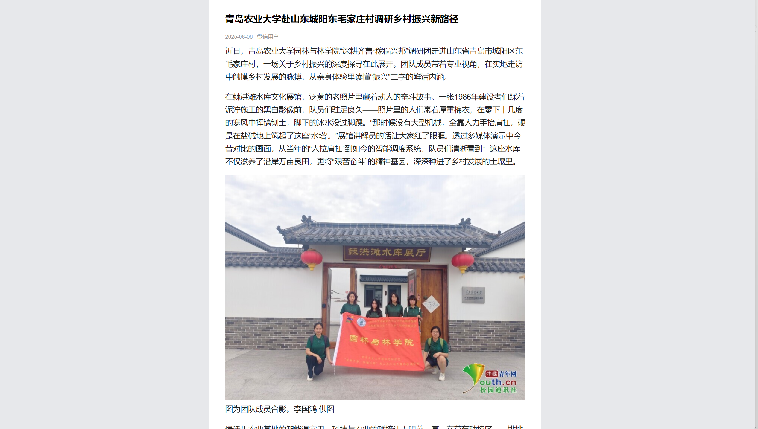 近日,永利3044noc集团官网园林与林学院“深耕齐鲁·稼穑兴邦”调研团走进山东省青岛市城阳区东毛家庄村,一场关于乡村振兴的深度探寻在此展开。团队成员带着专业视角,在实地走访中触摸乡村发展的脉搏,从亲身体验里读懂“振兴”二字的鲜活内涵。