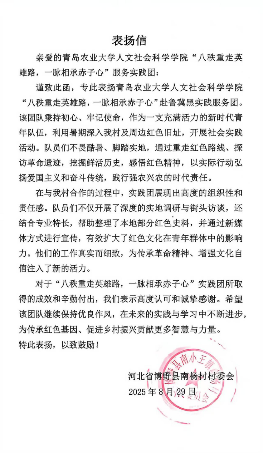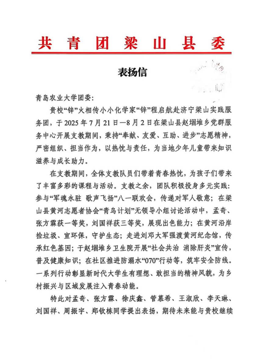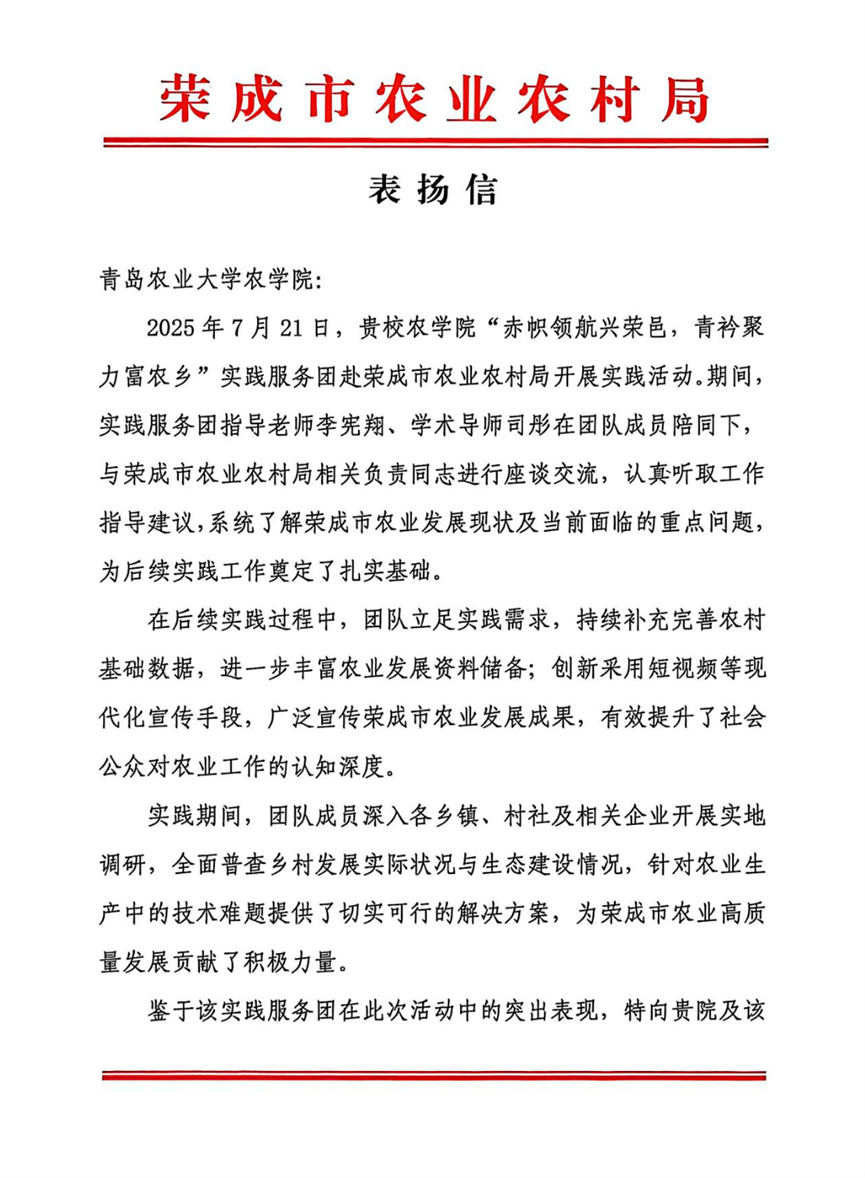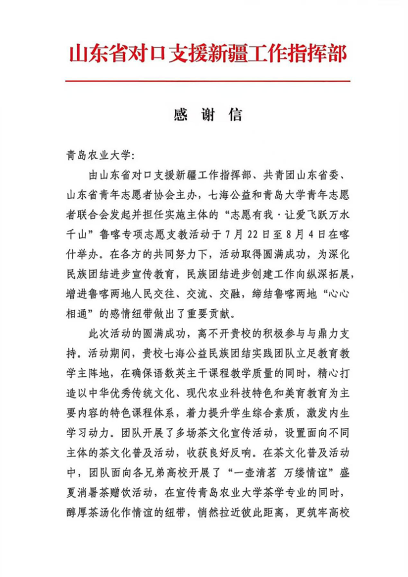 园艺学院“茶韵青农情洒新疆”支教服务团(七海公益民族团结实践团队)开展鲁喀专项支教,深化鲁喀文化交融,学校收到山东省对口支援新疆工作指挥部感谢信;农学院“赤帜领航兴荣邑,青衿聚力富农乡”实践团为助力荣成农业现代化发展贡献青春力量,获荣成市农业农村局、荣成市园林建设集团、崖西镇人民政府、滕家镇人民政府、虎山镇人民政府5家单位来信表扬;化学与药学院“锌”火相传小小化学家“锌”程启航赴济宁梁山实践服务团开展暖心支教与公益服务,收到共青团梁山县委表扬信和梁山县韩岗镇大屯村支部感谢信;化学与药学院“菁英聚莱,诗‘化’产芝”赴莱西实践团在莱西产芝湖新村深入调研,为非遗文化保护事业添砖加瓦,获中共莱西市产芝湖新村党委感谢信;永利3044noc集团官网“青农云护宠爱计划”实践团积极开展人畜共患病科普,收到青岛市消防救援支队特勤大队搜救犬站、佰诺宠物医院等5家单位表扬信;经济管理学院志愿服务队开展爱心助老、支教行动收到山东慧福文化传播有限公司等企业表扬信;人文社会科学学院“八秩重走英雄路,一脉相承赤子心”实践团重走红色足迹,做好红色文化传承工作,收到芦湖社区居民委员会、河北博野县南杨村村委会表扬信;农学院“桃葡萄好,莒果丰登”实践团为推动莒县特色果蔬产业升级建言献策,获日照市莒县果庄镇推荐为“优秀实践团队”。