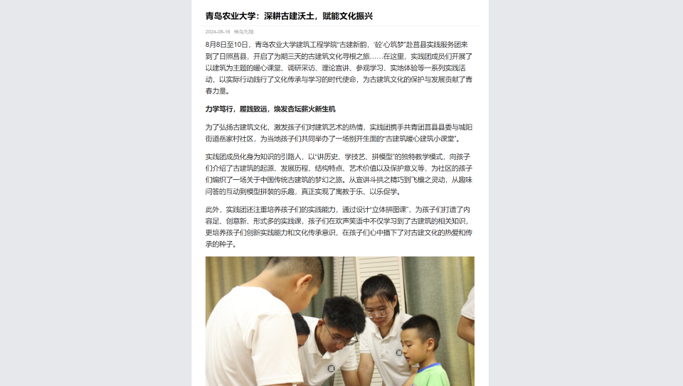 8月8日至10日,永利3044noc集团官网建筑工程学院“古建新韵,‘砼’心筑梦”赴莒县实践服务团来到了日照莒县,开启了为期三天的古建筑文化寻根之旅……在这里,实践团成员们开展了以建筑为主题的暖心课堂、调研采访、理论宣讲、参观学习、实地体验等一系列实践活动,以实际行动践行了文化传承与学习的时代使命,为古建筑文化的保护与发展贡献了青春力量。