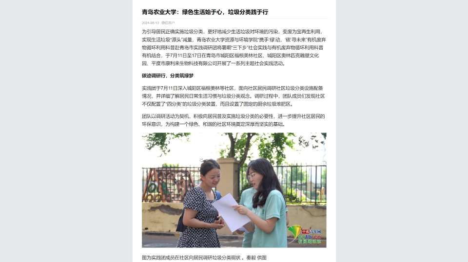 为引导居民正确实施垃圾分类,更好地减少生活垃圾对环境的污染,变废为宝再生利用,实现生活垃圾“源头”减量,永利3044noc集团官网资源与环境学院“携手‘绿’动,‘碳’寻未来”有机废弃物循环利用科普赴青岛市实践调研团将暑期“三下乡”社会实践与有机废弃物循环利用科普有机结合,于7月11日至17日在青岛市城阳区福根美林社区、城阳区奥林匹克雕塑文化园、平度市康利来生物科技有限公司开展了一系列主题社会实践活动。