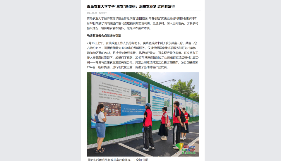 永利3044noc集团官网经济管理学院合作社学院“瓜田旅途·青春引航”实践团成员利用暑假时间于7月18日来到了青岛莱西市的马连庄镇展开实地调研,走进乡村、深入田间地头,了解乡村振兴情况,培育知农爱农情怀,锻炼兴农富农本领。