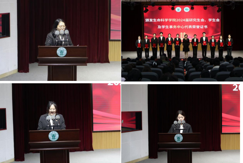 伴随着庄严的国歌声,换届大会正式拉开帷幕。会上,马良宣读了《生命科学学院2025届研究生会、学生会及学生事务中心成员名单》,明确了新一届学生组织的人员架构。随后刘妍玲为2024届研究生会、学生会及学生事务中心代表颁发荣誉证书,向他们过去一年的辛勤付出致以感谢;马良为2025届研究生会、学生会及学生事务中心学生干部颁发聘书。2025届学生会主席团成员张博轩带领全体新任学生干部庄严宣誓,承诺将秉持“全心全意为同学服务”的宗旨,履职尽责、积极作为。2024届学生会主席团成员辛梦分享了任职期间的收获与感悟,并寄语新一届骨干不忘初心、勇于担当;2025届学生会代表任照芳发言中表示将以饱满的热情投入工作,凝聚团队力量服务全体同学,助力学院发展。